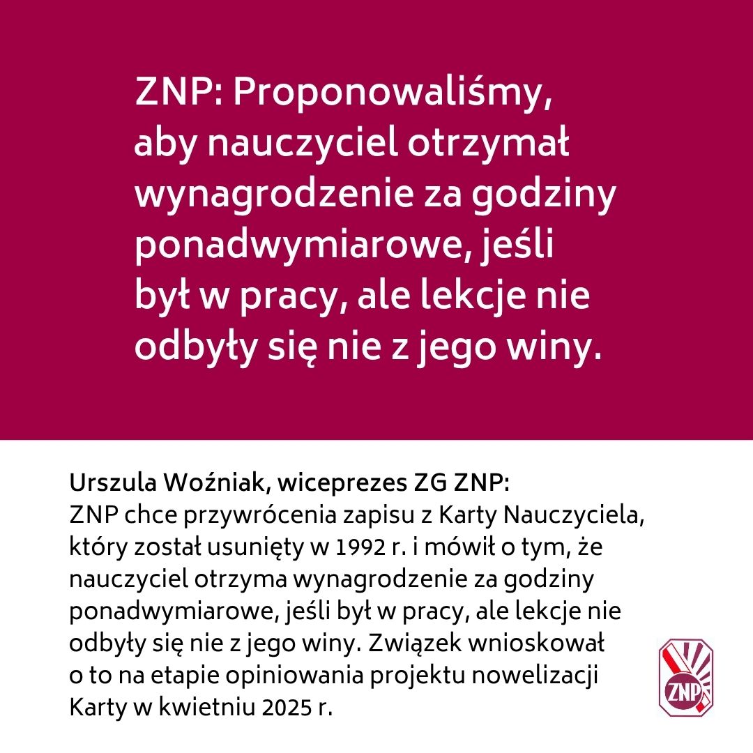 „Postulat ZNP, aby w tym zakresie przywrócić regulację art. 35 ust. 4 KN w wersji obowiązującej do lipca 1992 r., która utrzymywała prawo do wynagrodzenia z tytułu godzin ponadwymiarowych również w wypadku usprawiedliwionego nieodbycia zajęć.