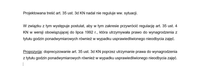 Propozycja: doprecyzowanie art. 35 ust. 3d KN poprzez utrzymanie prawa do wynagrodzenia z tytułu godzin ponadwymiarowych również w wypadku usprawiedliwionego nieodbycia zajęć”.