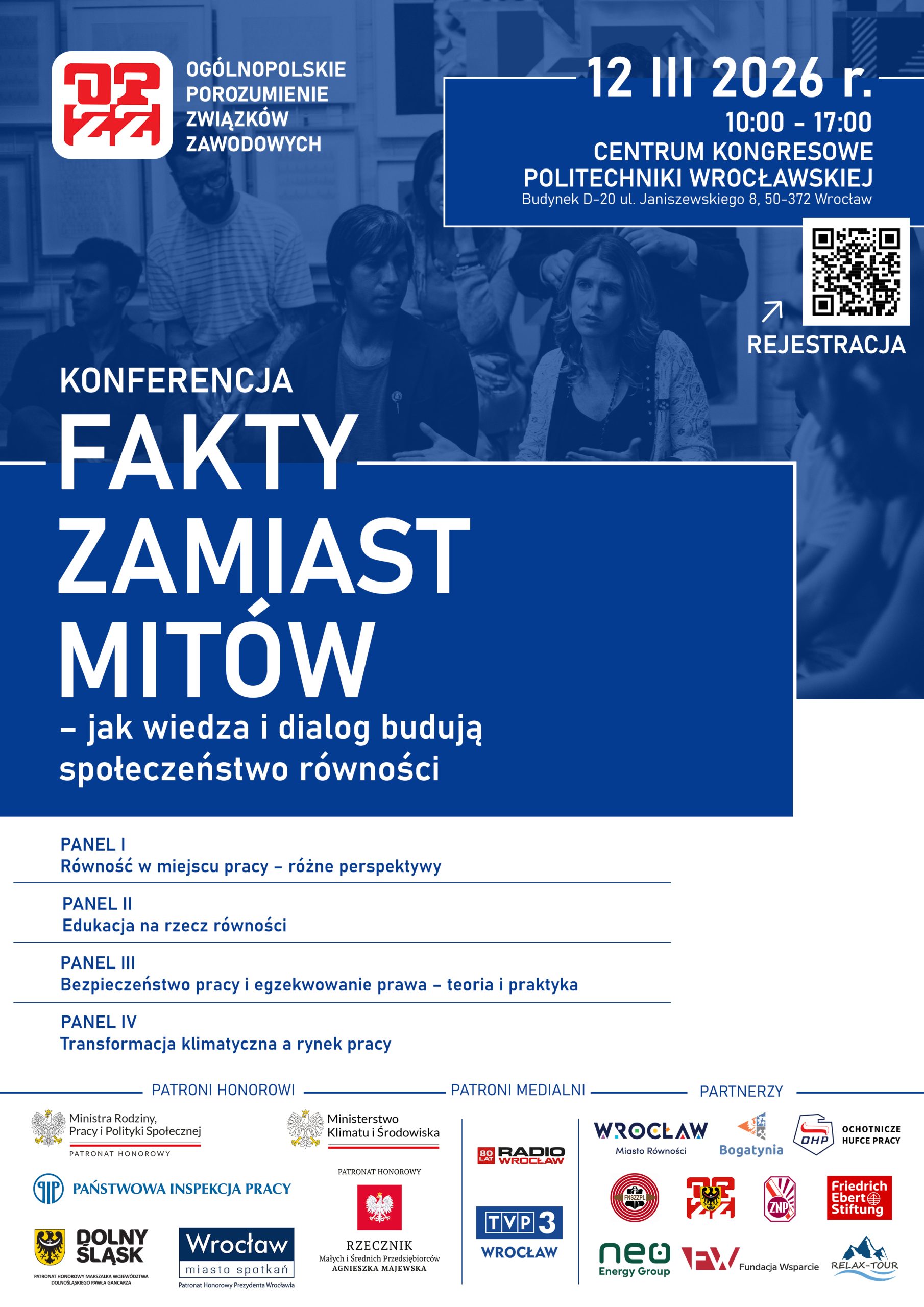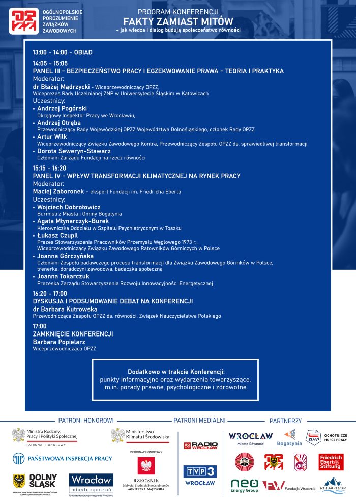 Patronat Honorowy nad wydarzeniem objęli: Ministra Rodziny Pracy i Polityki Społecznej, Minister Klimatu i Środowiska, Państwowa Inspekcja Pracy, Rzecznik Małych i Średnich Przedsiębiorstw, Marszałek Województwa Dolnośląskiego, Prezydent Wrocławia. Partnerami konferencji są: Miasto Wrocław, Miasto i Gmina Bogatynia, Ochotnicze Hufce Pracy, Federacja Niezależnych Samorządnych Związków Zawodowych Przemysłu Lekkiego, Fundacja „Wsparcie”, Fundacja im. Friedricha Eberta, Rada OPZZ Województwa Dolnośląskiego, Związek Nauczycielstwa Polskiego, Relax-Tour Sp. z o.o., Neo Energy Group Sp. z o.o.