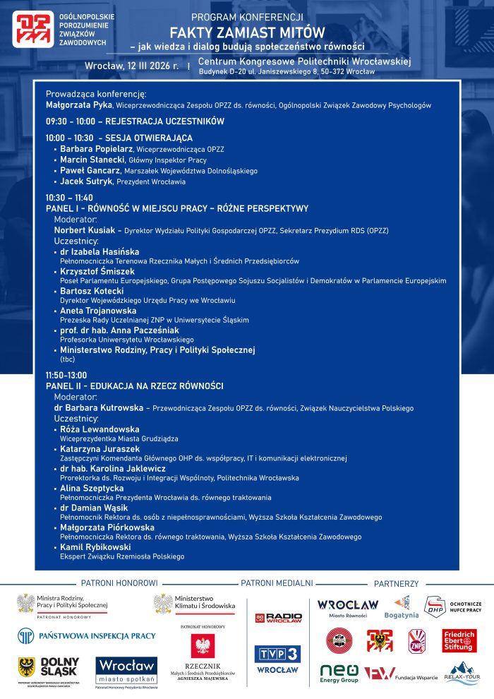 Partnerem konferencji jest ZNP. Konferencja stworzy przestrzeń do wymiany doświadczeń i dobrych praktyk pomiędzy administracją publiczną, samorządami, środowiskiem naukowym, pracodawcami oraz reprezentacją pracowników – związkami zawodowymi w sprawach pracowniczych. Istotnym elementem debaty będzie rola dialogu społecznego w przeciwdziałaniu nierównemu traktowaniu w miejscu pracy oraz dezinformacji, w tym w kontekście transformacji klimatycznej. W trakcie konferencji przewidziano punkty informacyjne oraz wydarzenia towarzyszące m.in. porady prawne, psychologiczne i zdrowotne.