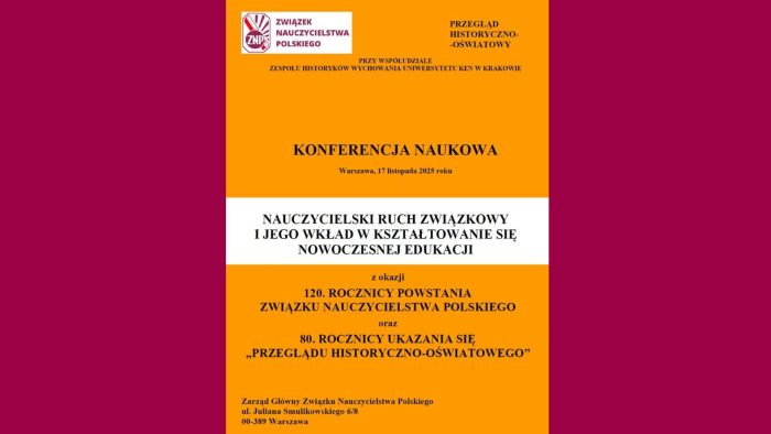Opis: Konferencja naukowa Nauczycielski ruch związkowy i jego wkład w kształtowanie się nowoczesnej edukacji w 120. rocznicę powstania Związku Nauczycielstwa Polskiego i zbliżającej się 80. rocznicy utworzenia „Przeglądu Historyczno-Oświatowego” organizuje Związek Nauczycielstwa Polskiego, Redakcja Przeglądu Historyczno-Oświatowego przy wsparciu Naukowej Rady Redakcyjnej i współpracy z pracownikami naukowymi z byłej Katedry Historii Edukacji i Pedagogiki Porównawczej Uniwersytetu Komisji Edukacji Narodowej w Krakowie. Celem konferencji jest poczynienie konstruktywnych refleksji nad dziejami i dorobkiem ruchu nauczycielskiego i pedagogicznego w Polsce w XX i XXI w. Obrady koncentrować się będą wokół zagadnień: