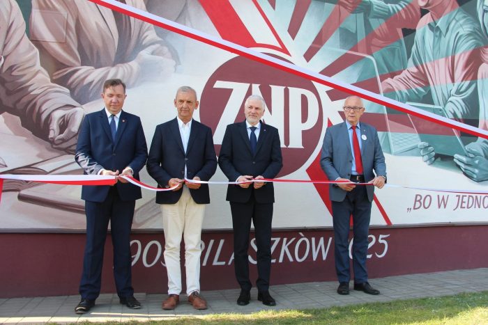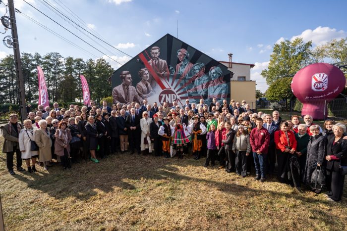 Członkowie Zarządu Głównego ZNP oraz zaproszeni goście w tym m.in. Łódzki Kurator Oświaty i Wójt Gminy Łowicz wzięli udział w odsłonięciu muralu na budynku Muzeum ZNP w Pilaszkowie.