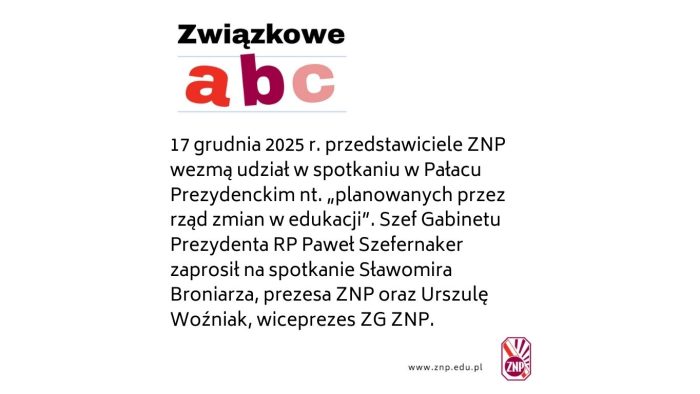 W środę, 17 grudnia 2025 r. przedstawiciele ZNP wezmą udział w spotkaniu w Pałacu Prezydenckim nt. „planowanych przez rząd zmian w edukacji”.