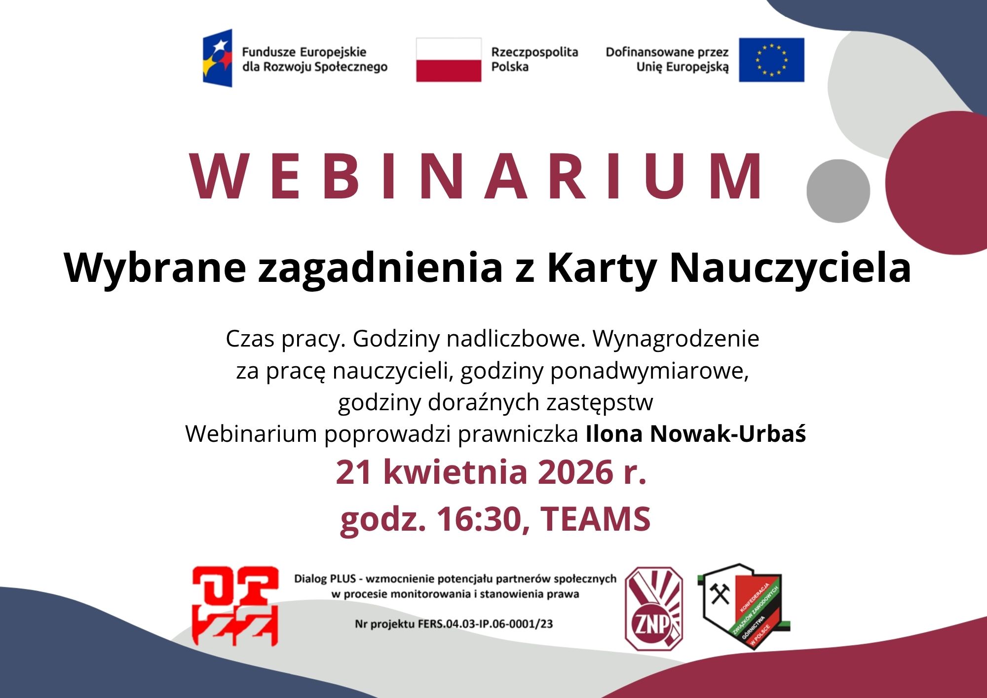 Zapraszamy do udziału w bezpłatnym webinarium ZNP „Wybrane zagadnienia z Karty Nauczyciela” dla członków i członkiń Związku Nauczycielstwa Polskiego. W programie m.in.: